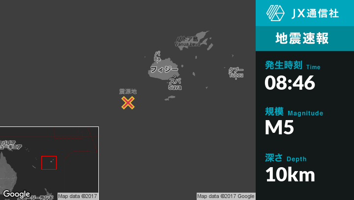 1月04日 08:46頃、フィジーのNadiから南西185kmの地点でM5の地震がありました。