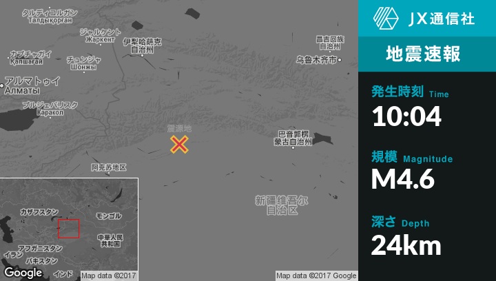 1月04日 10:04頃、中国のKuqaから西北西41kmの地点でM4.6の地震がありました。