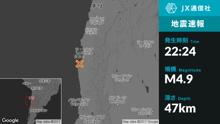 1月04日 22:24頃、チリのCoquimboから南南西42kmの地点でM4.9の地震がありました。