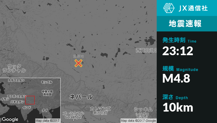 1月04日 23:12頃、中国のZhadongから北北西104kmの地点でM4.8の地震がありました。