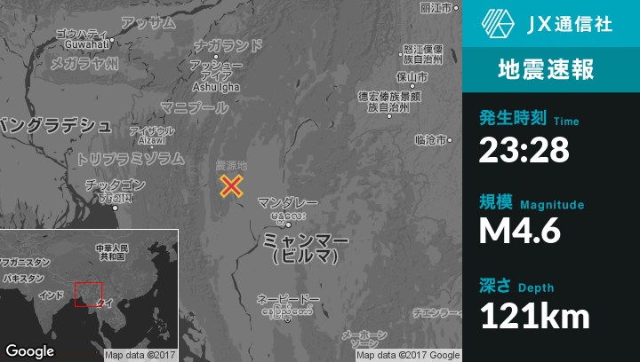 | 震源地 | ミャンマーのMawlaikから南南東79kmの地点 |