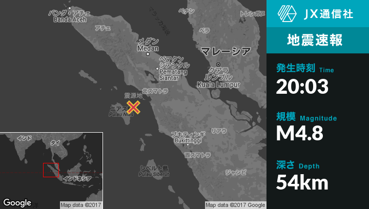 | 震源地 | インドネシアのSibolgaから西南西89kmの地点 |