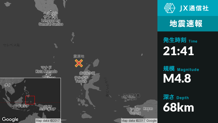 1月09日 21:41頃、インドネシアのTobeloから北西118kmの地点でM4.8の地震がありました。