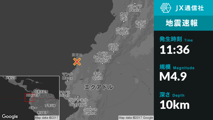 1月11日 11:36頃、エクアドルのMuisneから東南東2kmの地点でM4.9の地震がありました。
