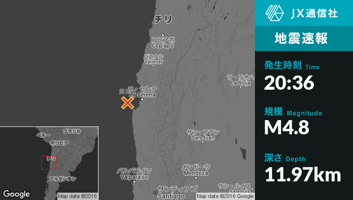 5月27日 05:36頃、チリのCoquimboから西54kmの地点で地震がありました。
