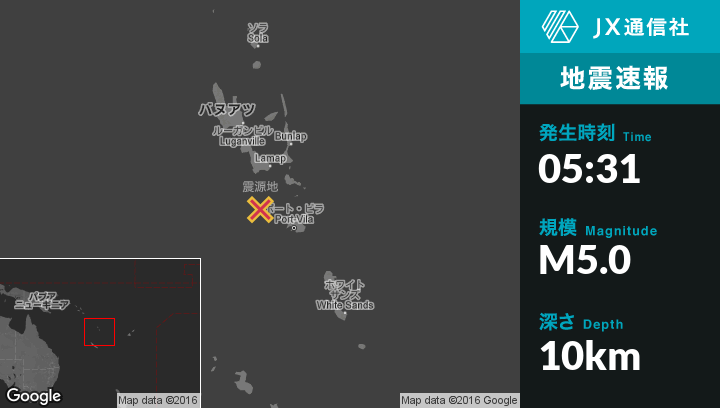 | 震源地 | バヌアツのPort-Vilaから北西96kmの地点 |