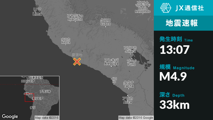 6月05日 13:07頃、ペルーのAcariから南東78kmの地点で地震がありました。