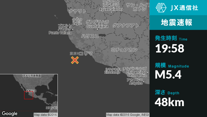 | 震源地 | メキシコのSan Patricioから南南西83kmの地点 |