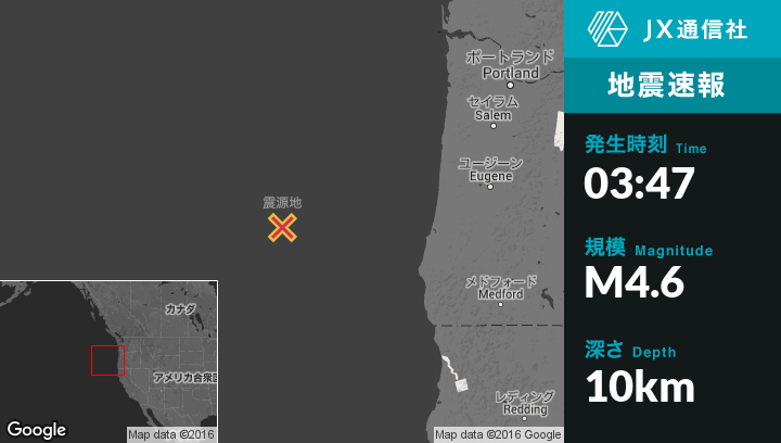 | 震源地 | オレゴン州のBandonから西北西240kmの地点 |