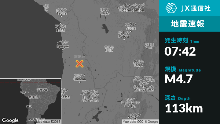 6月15日 07:42頃、チリのCalamaから北149kmの地点で地震がありました。