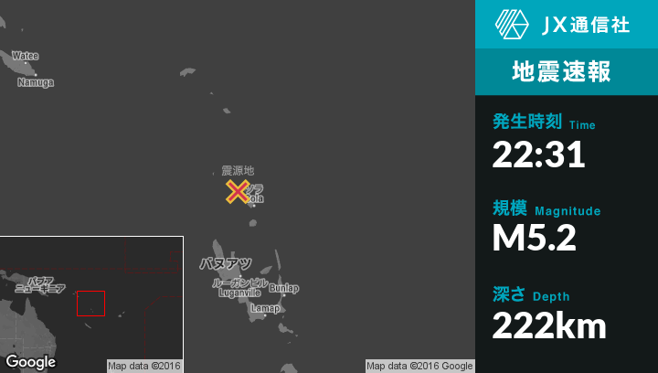 6月15日 22:31頃、バヌアツのSolaから北西66kmの地点で地震がありました。