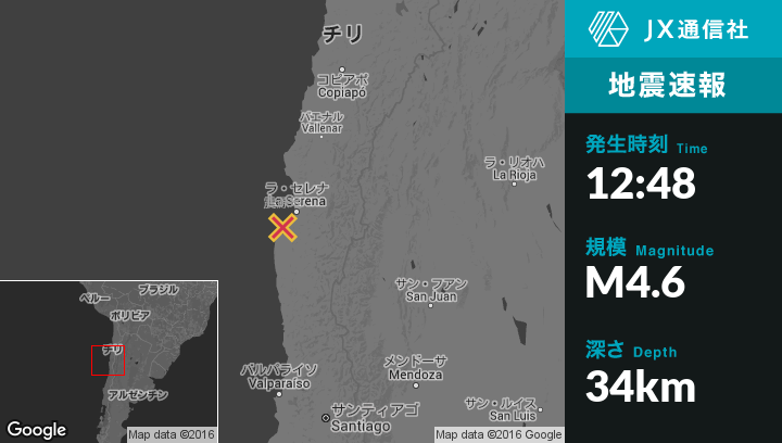 6月17日 12:48頃、チリのCoquimboから西南西22kmの地点で地震がありました。