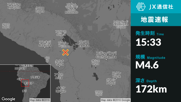 6月19日 15:33頃、ペルーのJuliから南南西61kmの地点で地震がありました。
