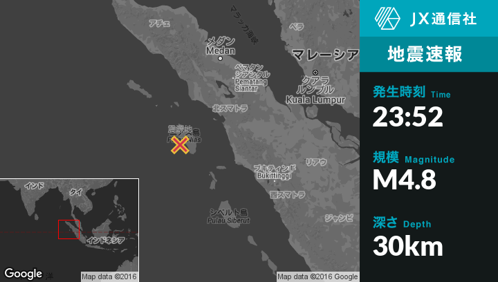 | 震源地 | インドネシアのSibolgaから西南西177kmの地点 |