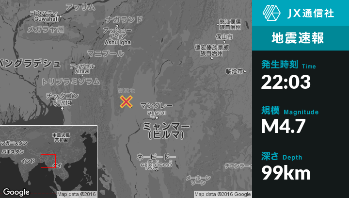 | 震源地 | ミャンマーのMonywaから北北西80kmの地点 |