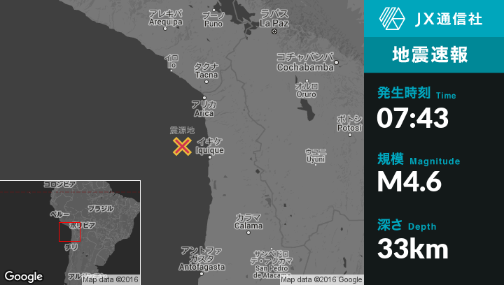 | 震源地 | チリのIquiqueから西北西102kmの地点 |