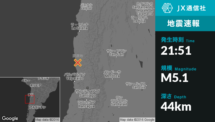 6月27日 21:51頃、チリのIllapelから南西26kmの地点で地震がありました。