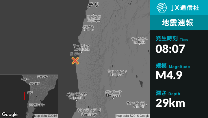 6月29日 08:07頃、チリのOvalleから西北西57kmの地点で地震がありました。