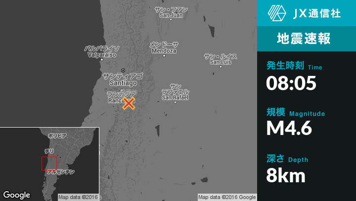 7月19日 08:05頃、チリのRengoから東南東43kmの地点で地震がありました。