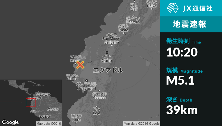| 震源地 | エクアドルのRocafuerteから東6kmの地点 |