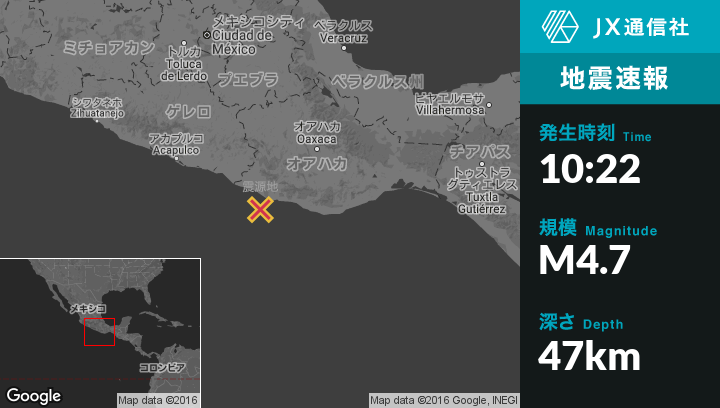 | 震源地 | メキシコのSanta Maria Huazolotitlanから南44kmの地点 |