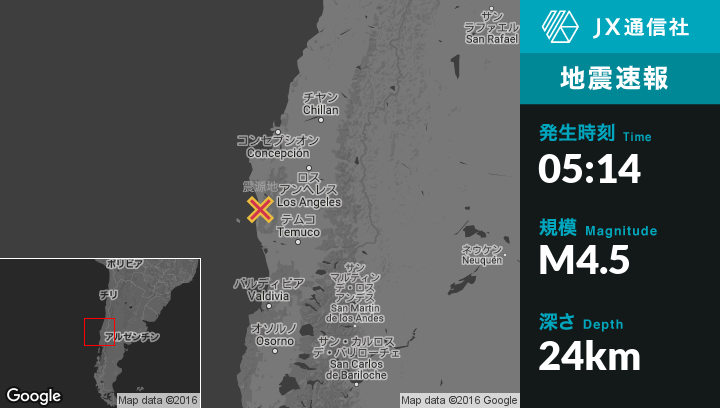8月28日 05:14頃、チリのCaneteから南31kmの地点でM4.5の地震がありました。