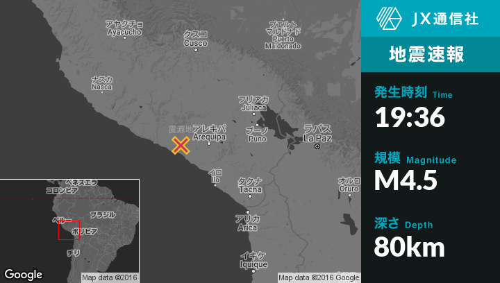 8月29日 19:36頃、ペルーのCamanaから北東42kmの地点でM4.5の地震がありました。