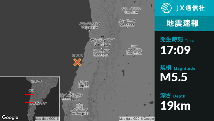 8月30日 17:09頃、チリのConstitucionから北北西49kmの地点でM5.5の地震がありました。