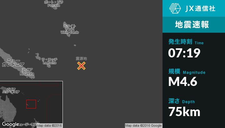 | 震源地 | ニューカレドニアのIle Hunterから西北西215kmの地点 |