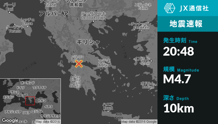 10月11日 20:48頃、ギリシャのNafpaktosから東南東6kmの地点でM4.7の地震がありました。