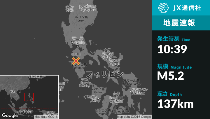 10月12日 10:39頃、フィリピンのTingloyから南南西7kmの地点でM5.2の地震がありました。
