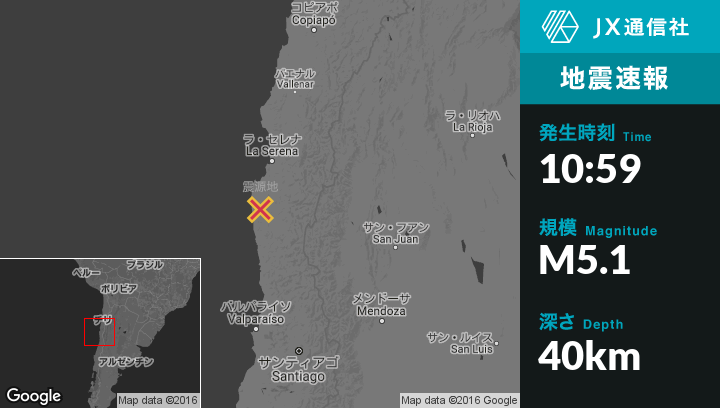 10月12日 10:59頃、チリのOvalleから西南西32kmの地点でM5.1の地震がありました。