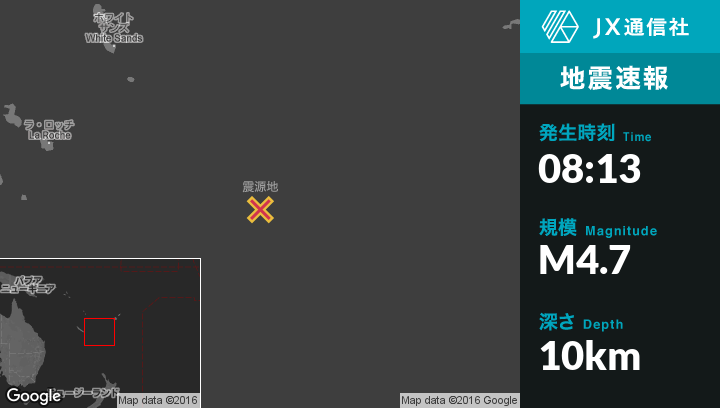 | 震源地 | ニューカレドニアのIle Hunterから東南東73kmの地点 |