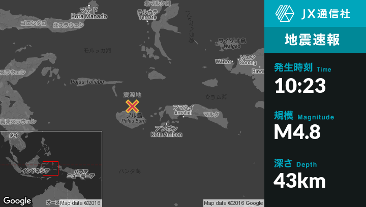 10月16日 10:23頃、インドネシアのAirbuayaから北東46kmの地点でM4.8の地震がありました。