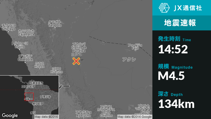 10月16日 14:52頃、ペルーのCampoverdeから南41kmの地点でM4.5の地震がありました。