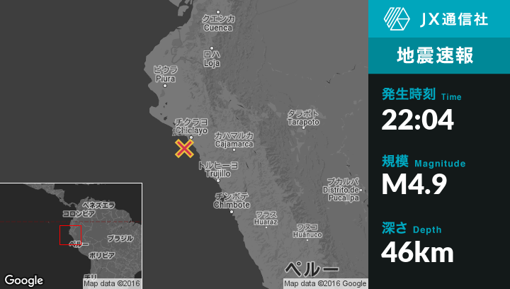 10月16日 22:04頃、ペルーのPimentelから南西22kmの地点でM4.9の地震がありました。