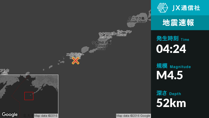 10月19日 04:24頃、アラスカのNikolskiから北北東3kmの地点でM4.5の地震がありました。