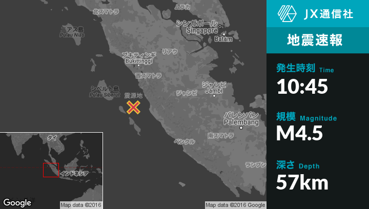 10月21日 10:45頃、インドネシアのPasarbaruから南南西85kmの地点でM4.5の地震がありました。