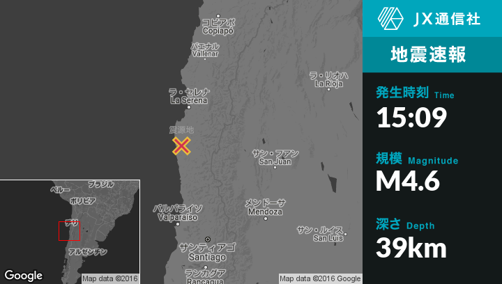 | 震源地 | チリのOvalleから南西39kmの地点 |