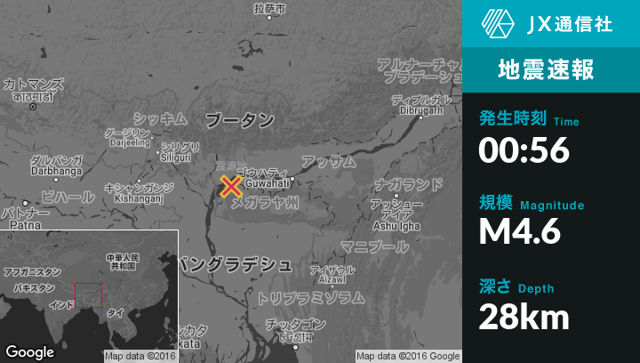 10月24日 00:56頃、インドのLakhipurから西北西9kmの地点でM4.6の地震がありました。