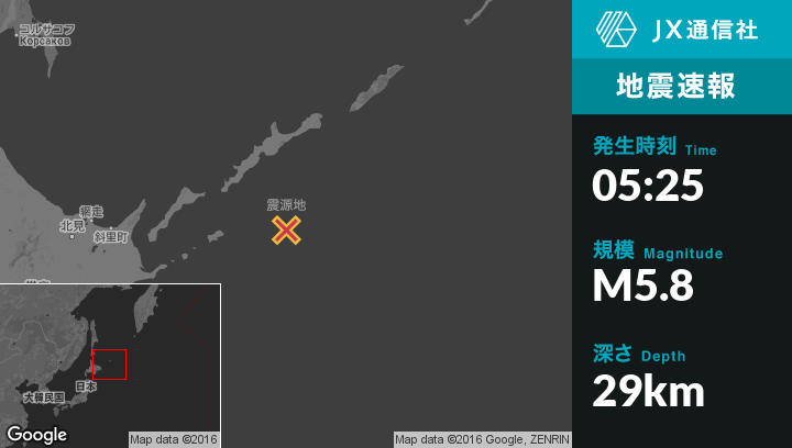 10月24日 05:25頃、ロシアのShikotanから東117kmの地点でM5.8の地震がありました。