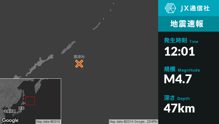 10月24日 12:01頃、ロシアのKuril'skから東223kmの地点でM4.7の地震がありました。