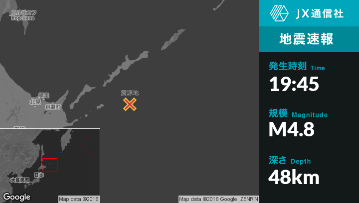 10月25日 19:45頃、ロシアのShikotanから東108kmの地点でM4.8の地震がありました。