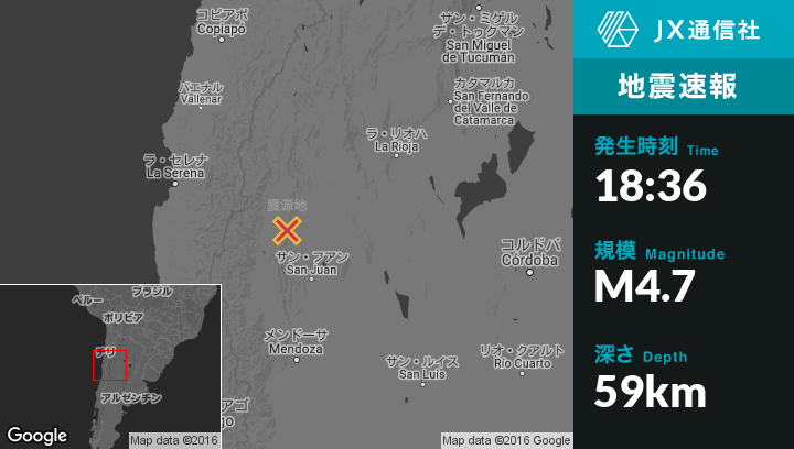 震源地アルゼンチンのSan Jose de Jachalから南南西48kmの地点