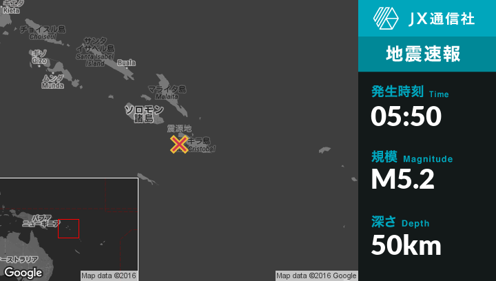 12月09日 05:50頃、ソロモン諸島のKirakiraから西68kmの地点でM5.2の地震がありました。