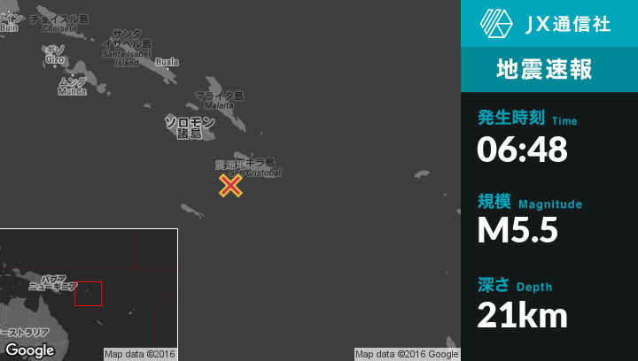12月09日 06:48頃、ソロモン諸島のKirakiraから西南西93kmの地点でM5.5の地震がありました。