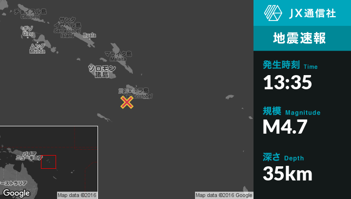12月09日 13:35頃、ソロモン諸島のKirakiraから南西81kmの地点でM4.7の地震がありました。
