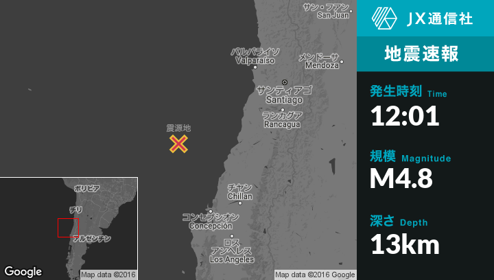 12月10日 12:01頃、チリのConstitucionから西北西156kmの地点でM4.8の地震がありました。