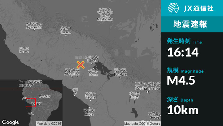 12月15日 16:14頃、ペルーのHuarichancaraから北東24kmの地点でM4.5の地震がありました。