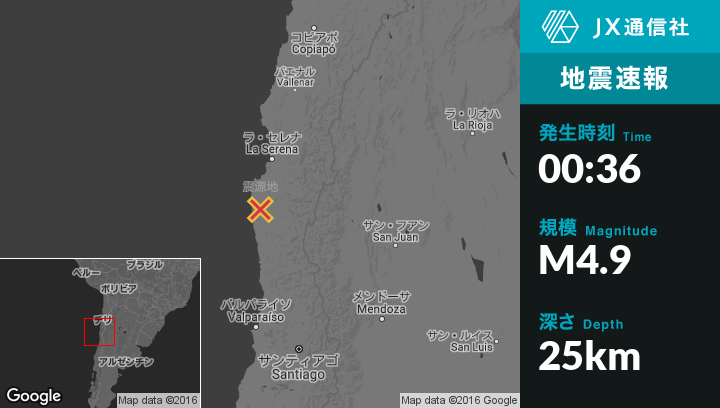12月20日 00:36頃、チリのOvalleから西南西35kmの地点でM4.9の地震がありました。
